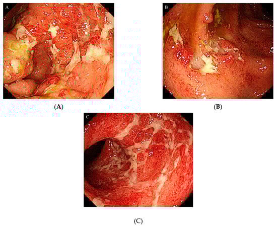 Colonoscopy showed severe inflammation in the colon mucosa: (A) Ascending colon; (B) Transverse colon; (C) Sigmoid colon.