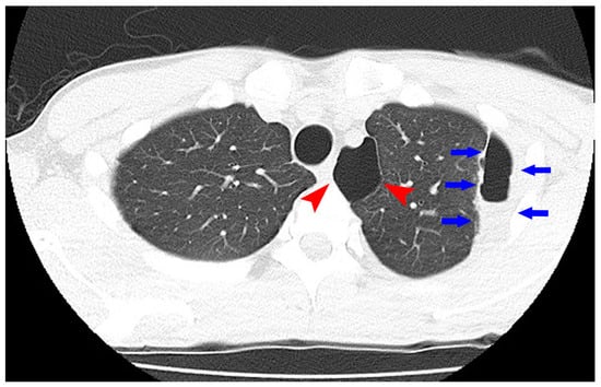 Computed tomography of the chest showed an emphysematous bulla (Arrowhead) in the upper left lobe of the lung and fluid formation inside the bulla (Arrow).