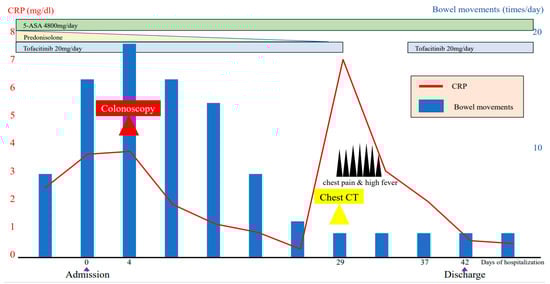 A 25-year-old man was admitted to our hospital for the treatment of a 12-year condition of UC. He was a non-smoker and had no syndrome. Previously, he was treated with drugs, such as mesalamine, immunomodulators, prednisolone, and the anti-TNFα anti-body, but remission was not maintained. He had been undergoing treatment with 5–10 mg/day of PSL for 10 years since the onset of UC. At our hospital, he was administrated TOF (20 mg/day) in order to withdraw PSL and eliminate PSL-dependent UC. However, even after remission therapy with TOF, his symptoms did not improve. On the 9th day of treatment, the abdominal symptoms worsened, and he was hospitalized. Table 1 shows the patient’s laboratory data at admission.