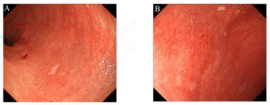 Colonoscopy showed mild inflammation in the colorectal mucosa, after one year of treatment with tofacitinib alone: (A) Sigmoid colon; (B) Rectum.