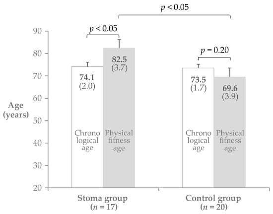 p < 0.05). In terms of PFA, the stoma group was significantly older than the control group (82.5 ± 3.7 vs. 69.6 ± 3.9 y: