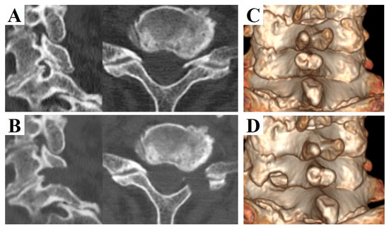Pre- and postoperative computed tomography (CT) images of a 73-year-old man who underwent left C6/7 full-endoscopic cervical foraminotomy (FECF). (A) Preoperative sagittal (left) and axial (right) CT images. (B) Postoperative sagittal (left) and axial (right) CT images. (C) Pre- and (D) postoperative 3-dimensional CT images. Note that the dorsal part of the vertebral foramen was removed after FECF.