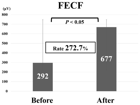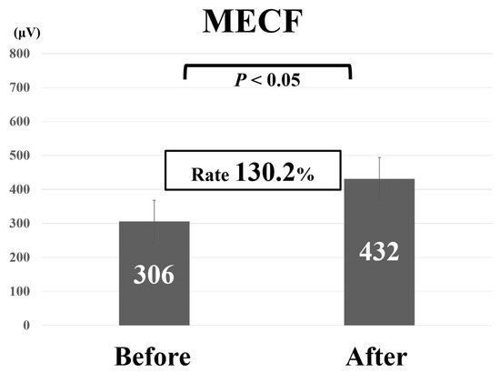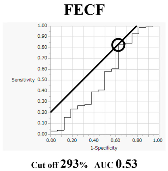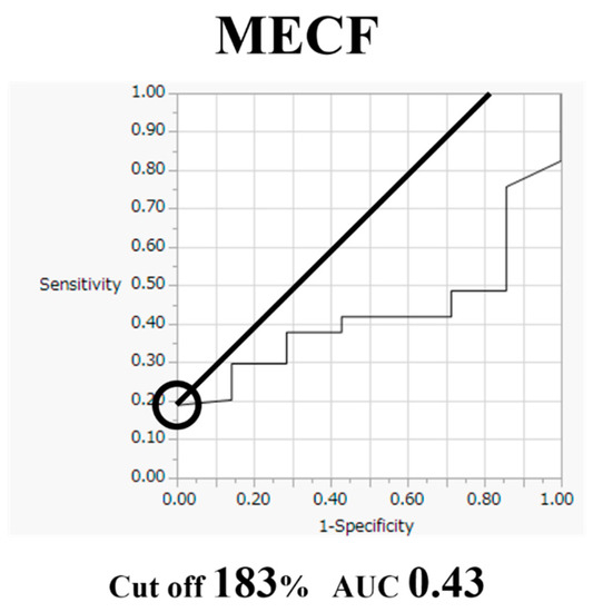 The cut-off value for the intraoperative MEP improvement rate in FECF was 293%, and that of MECF was 183%. Most previous reports have focused on neurological deterioration, using a 50–80% decrease in MEP amplitude as a criterion [18,19,20,21]. In a prospective multicenter study by the Spinal Cord Monitoring Working Group of the Japanese Society for Spine Surgery and Related Research, Kobayashi et al. reported 3 years’ experience of intraoperative MEP monitoring in 959 spine surgeries. In the study, the alarm point was set at a 70% decrease in amplitude and provided high sensitivity (95%) and specificity (91%) [22]. On the other hand, only two previous studies have focused on neurological improvement or surgical decompression of the spinal cord. In those studies, intraoperative MEP amplitude significantly improved during surgical decompression, and Wang et al. found a cut-off value of 150%, and Wi et al. found a cut-off value of 200% [8,9]. Our result is similar to those, but further data are needed to determine the cut-off point.