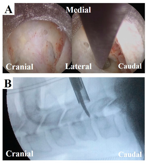 Intraoperative findings and fluoroscopic image at the final stage of FECF. (A) After removal of the dorsal part of vertebral foramen, the underlying nerve root could be seen (left). A curved dissector was inserted into the caudal area of the nerve root (right). (B) The position of the dissector is confirmed by a fluoroscopic image (lateral view, corresponding to the image in A, right).
