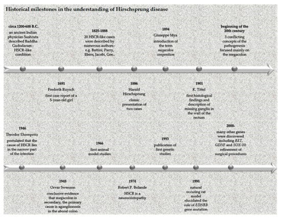 Although this eponymous disease is named after a Danish physician Harald Hirschsprung, who described it in 1886, it was actually a Dutch anatomist and botanist, Frederik Ruysch, who first mentioned this condition in 1691 as “enormis intestini coli dilatatio” in a case report of a 5-year-old girl. Therefore, an eponym Ruysch disease was created, although it is rarely used, despite Ruysch´s description being almost 200 years older than Hirschsprung’s []. The understanding of HSCR etiopathogenesis was obscure until 1948. The reason for this is that the research focus was largely misled by the most apparent clinical sign of the condition. This classic case of cause vs. consequence misattribution directed the researchers to focus on the enlarged part of the intestine in an attempt to find the underlying pathomechanism, while the truly diseased part was neglected. A breakthrough curative rectosigmoidectomy in 1947 and subsequent surgeries and experiments in 1948 eventually revealed that the culprit was aganglionosis of the aboral part of the intestine, while the enlargement above the affected part was merely a consequence of the stasis []. As shown in Figure 1, the historical timeline of HSCR is very complex, with widely known, but also less renowned names contributing to its description and understanding [,,].