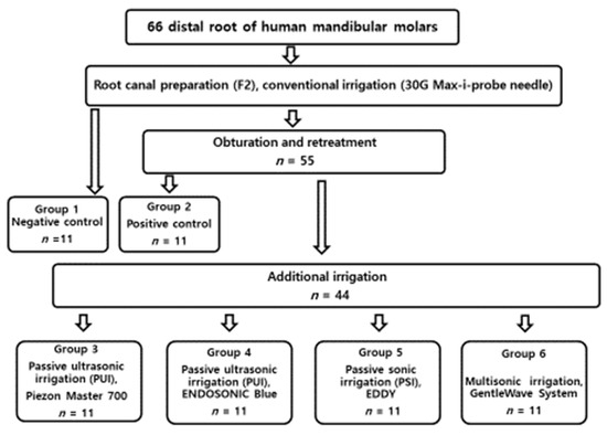 Primary root canal treatments involved conventional rotary instrumentation and irrigation. Conventional rotary instrumentation used shaping files (SX, S1, S2) and finishing files (F1 and F2 files) (ProTaper Files, Denstsply, Tulsa Dental Specialties, Tulsa, OK) spun at a speed of 300 rpm [15]. During instrumentation, 2 mL 3% NaOCl (diluted with distilled water; Clorox, Oakland, CA, USA) was delivered between the use of each instrument. RC Prep (Patterson Dental, Saint Paul, MN, USA) was used as necessary. Final conventional irrigation was performed with 3% NaOCl solution using a 30G Max-i-Probe irrigation needle (Dentsply Rinn, Elgin, IL, USA) and a syringe for 1 min at a flow rate of 5 mL/min followed by a 2 min rinse with 17% EDTA (Pulpdent Corporation, Watertown, MA, USA) at 5 mL/min and a final rinse with 1 mL saline solution. During irrigation, the irrigation needle was placed 1 mm short of the WL and was moved with a 1–2 mm up-and-down motion to prevent locking in the canal. Canals were dried with sterile paper points (Dentsply). Eleven samples were randomly selected as negative controls (Group 1).