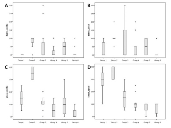 Box plots showing the distribution of values for the groups: (A,B) show the debris scores for the middle and apical regions, respectively; (C,D) show smear scores for the middle and apical regions, respectively. Small circles, mild outliers; asterisks, extreme outliers (individual values more than 1.5 interquartile range).