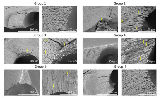 Representative SEM of the cross-sections of the six groups. SEM images show low (×150) and high (×600) magnifications of root canals. Note sealer remaining in dentinal tubules (arrows).