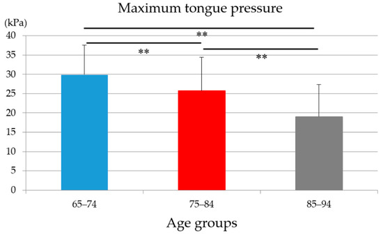 Figure 1. The maximum tongue pressure values of three age groups (ANOVA, ** p < 0.01).
