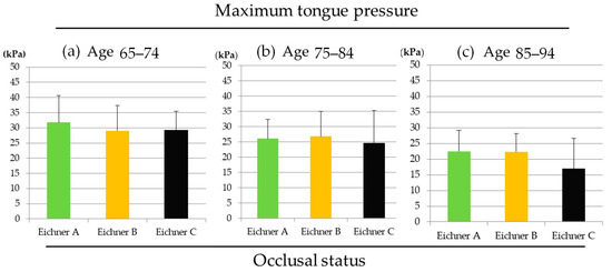 Figure 3. The maximum tongue pressure values of three occlusal status in (a) ages 65–74, (b) ages 75–84 and (c) ages 85–94 groups. (ANOVA, p > 0.05).