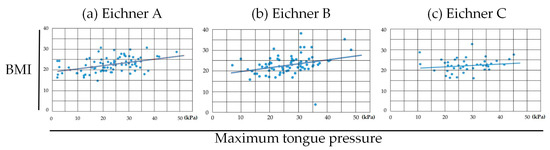 Between MTP and BMI within each occlusal status, statistically significant positive correlations were found in Eichner class B (r = 0.330: weak correlation, p = 0.003) and Eichner class C (r = 0.438: moderate correlation, p < 0.001) (Figure 5).