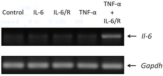 Upregulation of Il-6 in C6 glioma cells. Glioma cells were treated with IL-6, IL-6/sIL-6R, and TNF-α/IL-6/sIL-6R and examined for Il-6 and Gapdh gene expression via RT-PCR, respectively. IL-6/R represents IL-6/sIL-6R.