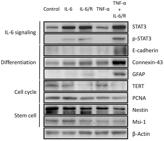 The differentiation state of C6 glioma cells determined according to biomarkers. Western blots of glioma cells were carried out after cytokine treatment. Biomarkers for IL-6 signaling (STAT3 and p-STAT3), differentiation (E-cadherin, connexin-43, and GFAP), cell cycle (TERT and PCNA), and stem cells (nestin and Msi-1) were monitored. IL-6/R represents IL-6/sIL-6R.