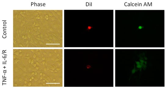 A dye-coupling assay was performed to evaluate the gap junction communication between C6 glioma cells. After treatment with IL-6 signaling elicitors, including IL-6 and TNF-α/IL-6/sIL-6R (TNF-α: 20 ng/mL, IL-6: 5 ng/mL, and sIL-6R: 100 ng/mL), for two days, donor cells (TNF-α/IL-6/IL-6R-treated and untreated cells) were incubated for 20 min with a dual label dye solution containing 0.3 M of isotonic PBS-glucose, 10 µM of DiI (Invitrogen), and 5 µM of calcein-AM (Invitrogen). Afterward, these cells were rinsed three times with PBS-glucose, trypsinized, suspended in the growth medium, and seeded onto confluent recipient cells (TNF-α/IL-6/sIL-6R-treated cells) at a ratio of 1 to 500. After incubating for 4 h, gap junction communication was assessed by the transfer of calcein from donor to recipient cells through fluorescence microscopy.