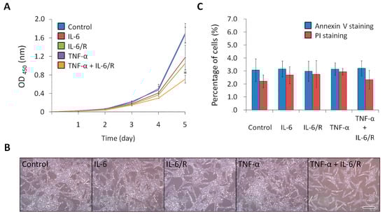 Cells were seeded into 96-well plates at a density of 200 cells/well in 100 µL of culture medium containing various IL-6 signaling elicitors, including IL-6, IL-6/sIL-6R, and TNF-α/IL-6/sIL-6R (TNF-α: 20 ng/mL, IL-6: 5 ng/mL, and sIL-6R: 100 ng/mL), for five days. The total cell population of each group was measured daily by a WST-1 assay (Roche, Indianapolis, IN, USA). The WST-1 reagent (10 µL/well) was added into culture medium and incubated for 4 h at 37 °C and 5% CO2. Afterward, the absorbance of the samples against a background control as a blank was measured at 450 nm.