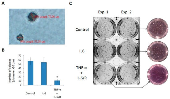 After IL-6 signaling elicitor treatment, including IL-6 and TNF-α/IL-6/sIL-6R (TNF-α: 20 ng/mL, IL-6: 5 ng/mL, and sIL-6R: 100 ng/mL), for two days, cells were filtered through 40-μm Falcon strainers (BD Biosciences) and seeded into the upper layer of 0.3% (w/v) noble agar (Sigma-Aldrich) in six-well plates at a density of 2500 cells/well to evaluate their tumorigenicity []. Seven days later, the diameters of the tumor colonies (25 random 200× fields) were measured using DP2-BSW imaging software (Olympus, Tokyo, Japan). Because not all of the colonies were spherical, the maximal diameter of each colony was determined. Cells were considered tumorigenic based on the number of colonies with a diameter of >50 μm. Subsequently, the cells were photographed after another incubation period of seven days.
