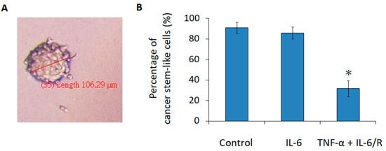 After being treated with IL-6 signaling elicitors, including IL-6 and TNF-α/IL-6/sIL-6R (TNF-α: 20 ng/mL, IL-6: 5 ng/mL, and sIL-6R: 100 ng/mL), for two days, cells were trypsinized, suspended in a serum-free medium, and filtered through 40-μm Falcon strainers (BD Biosciences). Subsequently, a single-cell suspension was prepared (10 cells/mL), seeded in 96-well plates (100 μL per well), and cultured in a serum-free medium supplemented with 20 ng/mL of basic fibroblast growth factor (bFGF; Sigma-Aldrich), 20 ng/mL of epidermal growth factor (EGF; Sigma-Aldrich), and 20 µL/mL of B27 supplement (Invitrogen). Afterward, wells containing only one cell were labeled sequentially from 1 to 40 and observed daily, while wells without cells or containing more than one cell were not included in the analysis. Six days later, the diameters of the floating spheres were determined using DP2-BSW imaging software (Olympus). The cells were considered tumorigenic if spheres with a diameter of >40 μm were observed.