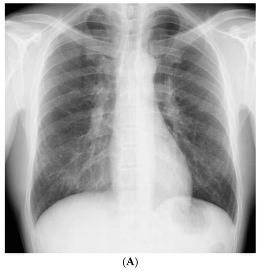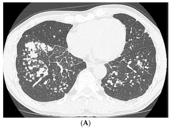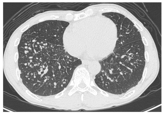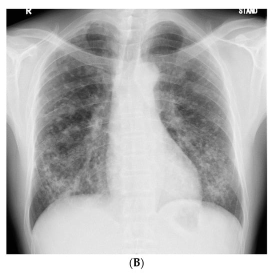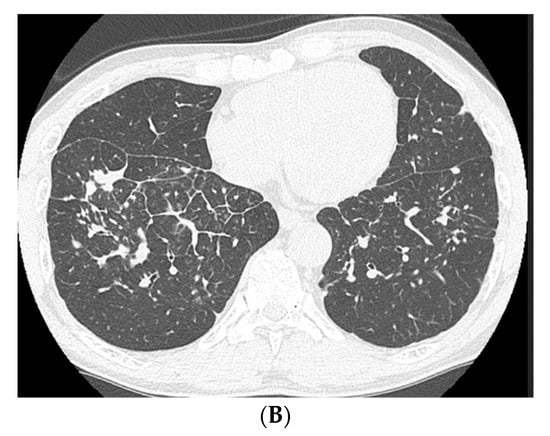 The patient did not display clinical respiratory symptoms such as dyspnea, exercise intolerance, or any other relevant manifestations upon referral to our hospital. The patient’s body temperature, pulse rate, and respiratory rate were 36.9 °C, 58 beats/min, and 20 breaths/min, respectively. On chest auscultation, fine crackles were audible in the bilateral lower lung fields. Clubbed fingers were not observed. Laboratory data on admission revealed elevated levels of PR3-ANCA (15.4 U/mL, cutoff level: 3.5 U/mL). Other representative tests for collagen disease-related autoantibodies were negative. Serum levels of angiotensin-converting enzyme, carcinoembryonic antigen, KL-6, and sIL-2R were in the normal range, and the results of interferon-gamma release assay were negative. The chest radiograph on admission showed an increase in the number of nodules compared with those found 1 year previously (Figure 1B).
