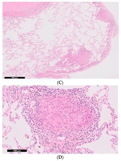 (A). Lung specimens from the lateral segment of the right middle lobe and anterior basal segment of the right lower lobe, obtained via video-assisted thoracoscopic surgery showing 5–12 mm sized nodules with dust deposition. The length of the scale bar is 5 mm; (B). Higher magnification of the nodules with dust deposition, surrounded by fibrotic changes and macrophages. The length of the scale bar is 200 μm; (C). Non-necrotizing granulomas along the lymphatic routes. The length of the scale bar is 500 μm; (D). Higher magnification of the non-necrotizing granulomas. The length of the scale bar is 100 μm.
