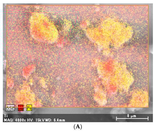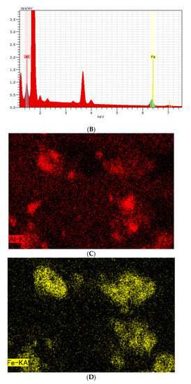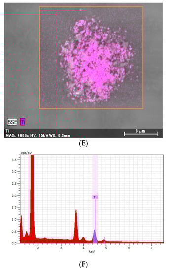X-ray microanalysis of particles in the lung specimens. Particles containing aluminum (Al) (A–C), iron (Fe) (A,B,D), titanium (Ti) (E,F), and silica. In Figure 4B,F, background peaks are also observed.