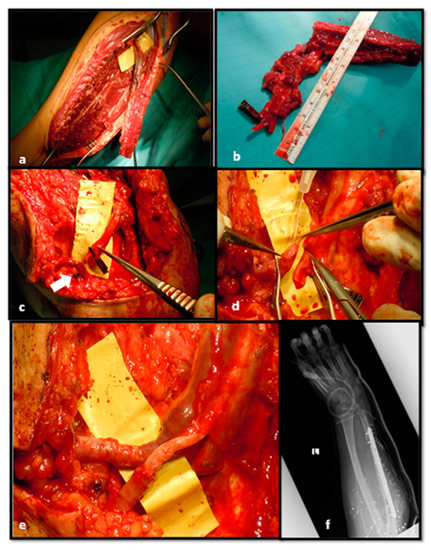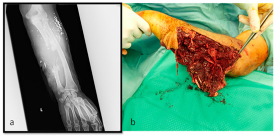 M.E., 50 years old (y/o), ballistic trauma on upper left arm (Patient #4). The patients reported important soft tissue damage on extensor and flexor muscles on the ulnar side. The ulnar neurovascular bundle was destroyed (ulnar nerve and arterial gap 10 cm). X-rays displayed important ulnar bone loss (Figure 3a,b).