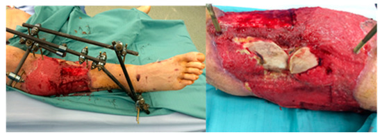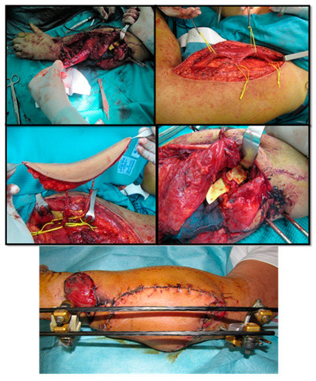 Initially, damage control was performed. An accurate debridement of injured and mangled muscular and tendon tissue is fundamental. Bone debridement and fixation were performed through external fixator. Therefore, Vacuum Assisted Therapy (VAC) was positioned, and broad-spectrum antibiotic therapy was initiated.