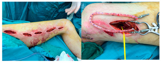 - Brüner, S.; Jester, A.; Sauerbier, M.; Germann, G. Use of a cross-over arteriovenous fistula for simultaneous microsurgical tissue transfer and restoration of blood flow to the lower extremity. Microsurgery 2004, 24, 114–117. [Google Scholar] [CrossRef] [PubMed]
