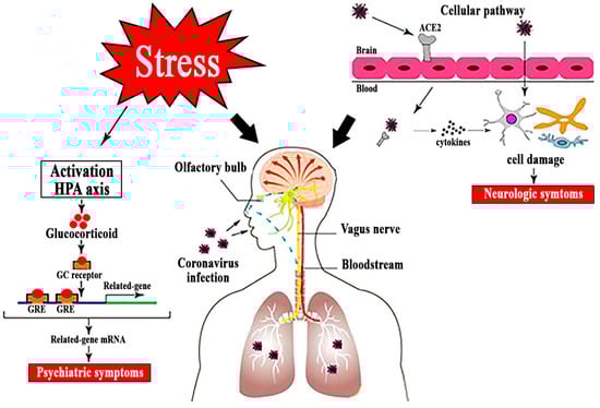 - Baig, A.M.; Khaleeq, A.; Ali, U.; Syeda, H. Evidence of the COVID-19 Virus Targeting the CNS: Tissue Distribution, Host-Virus Interaction, and Proposed Neurotropic Mechanisms. ACS Chem. Neurosci. 2020, 11, 995–998. [Google Scholar] [CrossRef]