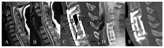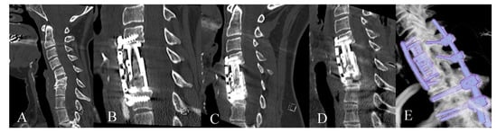 - Waschke, A.; Kaczor, S.; Walter, J.; Duenisch, P.; Kalff, R.; Ewald, C. Expandable titanium cages for anterior column cervical reconstruction and their effect on sagittal profile: A review of 48 cases. Acta Neurochir. (Wien) 2013, 155, 801–807, discussion 807. [Google Scholar] [CrossRef]