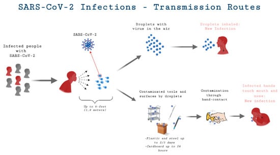 Scientific studies have shown that there are two main routes of transmission of COVID-19: direct (person-to-person touch or inhalation of short-range respiratory droplets) and indirect (airborne and fomite-mediated) [7,8,9]. Individuals may acquire indirect infection by getting into contact with contaminated surfaces and touching their oral, nasal, or ocular mucosal surfaces [10,11]. The infection is spread by large droplets formed by symptomatic patients while coughing and sneezing, which may also occur in infected, asymptomatic individuals [9,11,12,13]. Many symptoms have been reported, but the most commonly cited clinical symptoms are raised body temperature, dry cough, malaise, and dyspnea [12]. Computerized Tomography (CT) scan findings included pneumonia with anomalous findings in all cases. Although all demographics of the global population are at risk for COVID-19 infection, healthcare workers and patients hospitalized for other reasons are at a higher risk for COVID-19 due to the possibility of frequent close contact with symptomatic and/or asymptomatic individuals infected with COVID-19 [14].