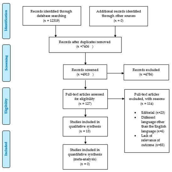A total of 12,319 articles were extracted for screening (Figure 2). The removal of duplicates resulted in 4913 articles. An additional 4786 articles were excluded based on title and abstract, leaving 127 for full-text assessments. The final systematic review included 13 publications after excluding 114 articles, which comprised editorial letters, lacked relevance to our desired outcomes, or used languages other than English.