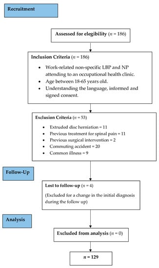 On the first day of attendance, the participants were interviewed by the physiotherapist in charge and sociodemographic information was collected, the content of the questionnaires was explained, and the questionnaires were completed only once, prior to any other therapeutic intervention. The duration of sick leave was measured by the days off from the day of the accident at work until the patients returned to work. Any re-injury or setback of the same LBP and NP disorder after the six months after the day of return to work were considered to be part of the same process of sickness absence and therefore were recorded as the same sickness absence. Any change in the initial diagnosis of nonspecific low back or neck pain of any of the participants throughout the follow-up process would cause them to not meet the inclusion criteria and be excluded from it. The recruitment process is shown in Figure 1.