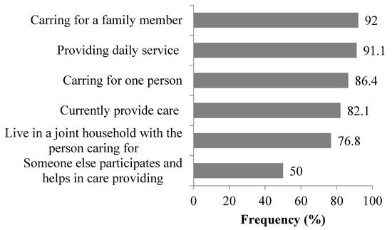In our study, the majority of informal caregivers currently provide care (81.2%) for a person who is a family member (92%) on a daily basis (91.1%) and live in the same household with the person they care for (76.8%). EU [16,17] data shows that almost 50% of the family caregivers are children of the elderly care recipients and that 20%–45% are partners/spouses. Furthermore, 48% live in the same household as the person they care for, while 18% live nearby. According to the US 2015 Caregiving Report [18], 44 million Americans over the age of 18 provide help and support to an elderly family member, friend, or adult with a disability. In our study, the median time spent in informal care was five years, which corresponds to data obtained in the EU.