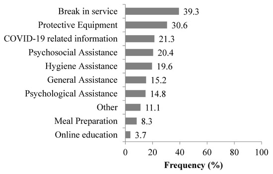 The most frequent needs informal caregivers have reported were: break in service (39.3%), personal protective equipment (30.6%), and COVID-19 related information (21.3%). Other reported needs of informal caregivers during the COVID-19 epidemic in Serbia are presented in Figure 2.