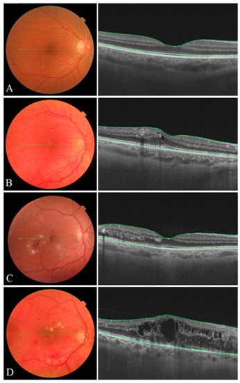 Color eye fundus images of the human retina (left) and high–quality SD OCT images (right) of the macula representing various stages of DR severity: (A) mild DR, (B) moderate DR, (C) severe DR, (D) proliferative DR. Mild DR is characterized by microaneurysms, moderate DR is distinguished by more microaneurysms but less than seen in severe DR. Signs of severe DR include the following: dot-and–blot-hemorrhages, venous beading, cotton wool spots, exudates and intraretinal microvascular abnormalities (IRMA). A clinical sign of proliferative DR is neovascularization, which can lead to macular edema.