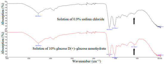 Manually (upper build) and automatically (lower build) detected absorbance peaks in the region of interest (black arrows) by ATR–FTIR spectroscopy on the same patient using different solutions (black curve: solution of 0.9% sodium chloride, red curve: 10% glucose D(+)–glucose monohydrate).