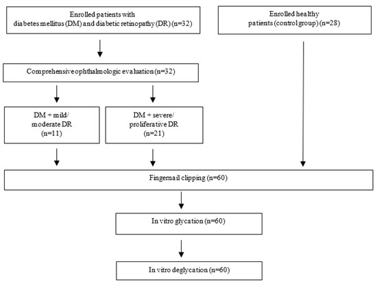 Background and objectives: Glycation occurs in a variety of human tissues and organs. Knowledge about the relationship between predictive biochemical factors such as absorption of glycated nail proteins and severity of type 2 diabetes mellitus (DM) and diabetic retinopathy (DR) remains limited. Materials and Methods: The study group consisted of patients with type 2 DM and DR (n = 32) and a control group (n = 28). Each patient underwent a comprehensive ophthalmic examination. The glycation process in nail clippings was evaluated in stages of in vitro glycation and deglycation stages. ATR–FTIR spectroscopy was used to calculate the infrared absorption in the region of interest. The absorption of solutions with nail clippings was evaluated by NanoDrop spectrophotometry. Absorption spectra differences before and after the exposure to fructosamine 3-kinase were compared between DM patients with DR and the control group. Results: The absorption of glycated nail protein greater than 83.00% increased the chance of developing DM and DR (OR = 15.909, 95% CI 3.914–64.660, p < 0.001). Absorption of glycated nail protein by ATR–FTIR spectroscopy in patients with DM and DR in vitro glycation was statistically significantly higher than in the control group; also absorption of solution with nails by NanoDrop spectroscopy was statistically significantly higher than in controls in vitro glycation and in vitro deglycation. After exposure to fructosamine 3-kinase, absorption of nail protein in DM + severe/proliferative DR group was statistically significantly lower in comparison with DM + mild/moderate group DR. Conclusions: Evaluation of glycated nail protein could be applied to evaluate the risk of having DM and for long-term observation of DM control.