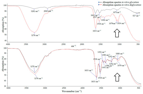 Absorption spectra (% ± SD) of in vitro glycation and in vitro deglycation by ATR–FTIR spectroscopy (970 and 1140 cm−1) and NanoDrop spectroscopy (530 nm). * p < 0.05.