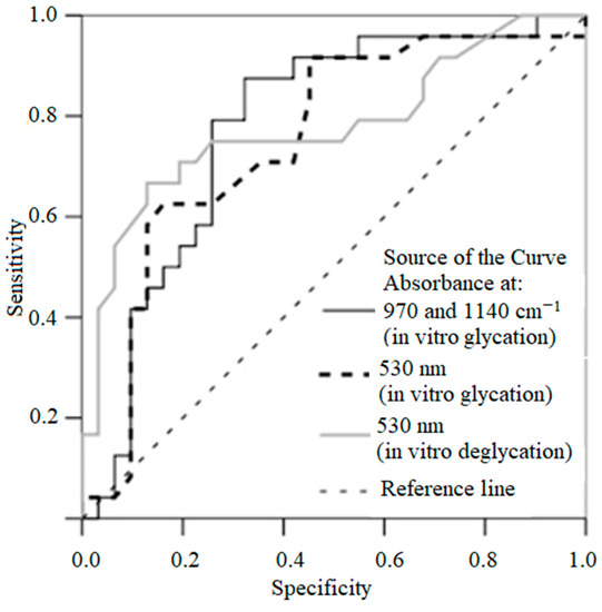 ROC curve representing the prognostic value of absorption of nail clippings by ATR–FTIR spectra in vitro glycation, of absorption of solution in vitro glycation and in vitro deglycation. The closer the curve is located to upper-left hand corner and the larger the area under the curve, the better is the predictive ability of the parameter.