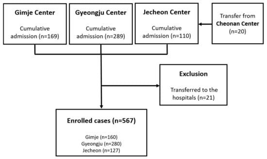 A multicenter retrospective study was conducted in three CTCs in South Korea. The participating centers were able to admit 136 to 235 COVID-19 patients with mild symptoms, and were located near Daegu, where the largest outbreak occurred in South Korea (Gimje, Gyeongju, and Jecheon). The opening dates of each center were as follows: Gyeongju, 3 March 2020; Jecheon, 9 March 2020; and Gimje, 11 March 2020. As the outbreak was stabilized, some CTCs closed and patients were transferred to other centers: Jecheon closed on 3 April 2020; Gimje, 7 April 2020; and Gyeongju, 14 April 2020.