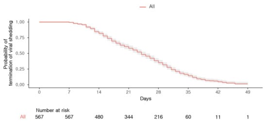 Multivariate Cox proportional hazards analysis was performed to identify variables that were associated with the probability of termination of viral shedding. All statistical analyses were carried out using the statistical package, R (version 4.0.0, R Foundation for Statistical Computing). The statistical significance level was set at p < 0.05.