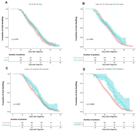 Kaplan–Meier curve for the probability of viral shedding according to the characteristics. (A) By sex, (B) by isolation type, (C) by presence of COVID-19-associated symptoms, and (D) by underlying comorbidities. The shaded areas represent pointwise 95% confidence intervals.