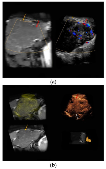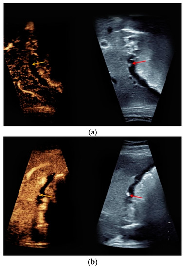 - Sidhu, P.S.; Cantisani, V.; Dietrich, C.F.; Gilja, O.H.; Saftoiu, A.; Bartels, E.; Bertolotto, M.; Calliada, F.; Clevert, D.A.; Cosgrove, D.; et al. The EFSUMB Guidelines and Recommendations for the Clinical Practice of Contrast-Enhanced Ultrasound (CEUS) in Non-Hepatic Applications: Update 2017 (Long Version). Ultraschall Med. 2018, 39, e2–e44. [Google Scholar] [CrossRef]