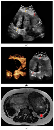 | #1 | 30 | 27 | Renal angiomyolipoma | B-mode: hypoechoic, 14 cm Doppler: no hypervascularization CEUS: rapid early contrast enhancement, slight late wash-out | T1-hypointense, T2-hypointense, restricted diffusion |
