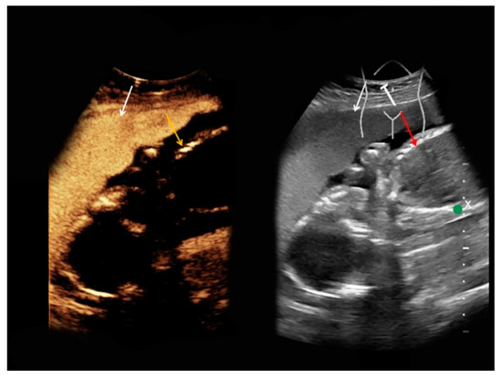 - Schwarze, V.; Marschner, C.; Negrão de Figueiredo, G.; Mueller-Peltzer, K.; Neumann, J.; Rübenthaler, J.; Clevert, D.A. SonoVue® Does Not Appear to Cross the Placenta as Observed During an Examination Aimed at Confirming a Diagnosis of Liver Echinococcosis in a Pregnant Woman. Ultraschall Med. 2020, 41, 146–147. [Google Scholar] [CrossRef] [PubMed]