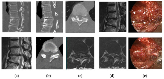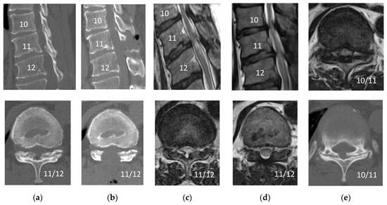 Pre- and postoperative findings (Patient 10). Computed tomography scan, (a) preoperative (T11/12), (b) postoperative (T11/12), (e) preoperative T10/11; T2-weighted magnetic resonance imaging, (c) preoperative (T11/12), (d) postoperative (T11/12), (e) postoperative (T10/11): The patient underwent an initial surgery at the level of T11/12, the T10/11 stenosis has worsened postoperatively.