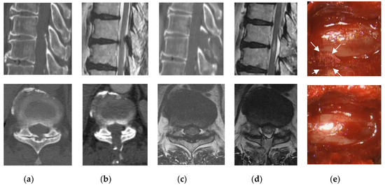 - Hur, H.; Lee, J.K. Thoracic myelopathy caused by ossification of the ligamentum flavum. J. Korean Neurosurg. Soc. 2009, 46, 189–194. [Google Scholar] [CrossRef]