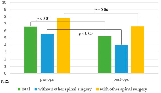 The mean pre- and postoperative NRS scores in all cases were 6.6 and 5.3, respectively. The mean postoperative NRS score improved statistically (p < 0.01). In addition to thoracic spinal stenosis, 12 patients had symptomatic cervical and/or lumbar spine stenosis. In nine cases, other surgeries were required before or after thoracic spine surgery. Eight cases had a history of cervical or lumbar spine surgery prior to thoracic spine surgery; four required additional cervical or lumbar spine surgery after thoracic spine surgery. We therefore reanalyzed the mean NRS scores in two different subgroups (the patients who underwent thoracic spine surgery alone and the patients who underwent other cervical or lumbar spine surgery). There was a statistically difference between the mean NRS scores in the former group (p < 0.01) but not in the latter group (p = 0.06) (Figure 4).