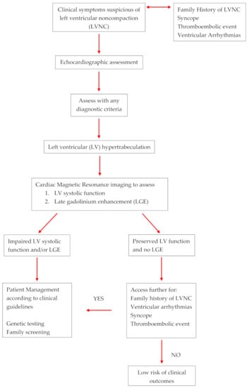 In an effort to improve the overall diagnostic accuracy, a clinical algorithm has been developed to help guide clinicians in the assessment of patients with suspected LVNC []. The authors have proposed that LVNC can be evaluated with either 2-d echo or CMR imaging and diagnosed with any criteria. Following this suggestion and based on the most current evidence, we that recommend all patients with hyper-trabeculation fulfilling any of the imaging-based criteria either 2D echo or CMR should be assessed for impaired LV function and LGE. For these patients, clinical management should continue as per standard clinical guidelines and should include family screening and/or genetic testing. For those with normal LV function and no LGE, patients should be screened for a family history of LVNC or SCD, syncope, ventricular arrhythmias and thromboembolic events to help predict the risk of adverse events and the need for further assessment. In the absence of these risk factors, patients can be reassured with less intensive long-term follow up; Figure 1.