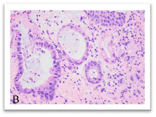 During hospitalization, an external–internal biliary drainage (DBEI) was placed for palliative purposes. An echo-endoscopy was also performed in order to characterize the lesion highlighted on CT, but the procedure was not conclusive; the pathological diagnosis highlighted the presence of non-cohesive epitheliomorphic cellular elements with nuclear atypia. Immunohistochemical investigations showed a positivity for Cytokeratin 7 (CK 7). The patient was discharged after 27 days of hospitalization with DBEI drainage and placed within an appropriate oncological follow-up; moreover, he was directed to chemotherapeutic treatment according to guidelines. Eight months after discharge, the patient visited the emergency department of the same polyclinic due to the occurrence of hematuria. On physical examination, he was apyretic and his hemodynamic parameters were stable. A complete abdominal ultrasound was also performed which highlighted a 5 mm wall thickening of the right floor of the bladder with associated modest right pyelic dilation. The patient was then transferred to the geriatrics ward of the same polyclinic, where, following the replacement of the biliary drainage, he developed a clinical–laboratoristic picture compatible with sepsis, likely to depart from the biliary tract, successfully treated with extensive intravenous broad-spectrum antibiotic therapy. Due to persistent macrohematuria and consequent anemia, the patient was transferred to the O.U. of Urology and underwent blood transfusion and TURBT of the bladder lesion highlighted on ultrasound. A bladder biopsy was thus performed at the urology department of the same polyclinic. Two sections stained with hematoxylin–eosin were obtained from the biopsy fragments. On microscopic observation, the presence of clearly malignant cells, with moderate architectural differentiation, was observed in the context of the suburothelial connective tissue (Figure 2A–C). The lesion infiltrated the bladder wall to full thickness in both sections and was made up of elements with marked cytological atypia, mostly organized in acinar-like glandular structures. These structures showed an irregular morphology, with distorted lumens and sketches of ramifications. Inside the lumens, cellular debris were seen, along with neutrophilic granulocytes. Focuses of small irregular glands and single pleomorphic cells immersed in the stroma were also noted peripherally, as if from tumor budding. The stroma showed a desmoplastic appearance, with a marked amount of fibroblasts and collagen and scattered lymphocytes. The cells showed an irregular, roughly cuboidal, morphology and possessed an eosinophilic cytoplasm. The nuclei appeared increased in size, with irregular contours, marked pleomorphism and hyperchromasia; nucleoli were sometimes prominent. Even with due caution, based on these morphological findings, we were more oriented towards the diagnosis of an adenocarcinoma. To identify the origin of the lesion, immunohistochemical investigations were then carried out which showed a positivity for CK7, Carbohydrate antigen 19.9 (CA19.9) and CDX2 (Figure 3A–C). The hypothesis of an intestinal and prostatic adenocarcinoma was ruled out by the negativity of Cytokeratin 20 (CK20) and PSA, respectively (Figure 3D,E). The immunophenotype was also negative for GATA3, which was useful for excluding a primitive urothelial neoplasm with reasonable certainty (Figure 3F). The immunohistochemical profile appeared suggestive for a bilio-pancreatic primitivity of the lesion, and the case was eventually diagnosed with extrinsic infiltration of the bladder wall by ductal adenocarcinoma of the pancreas. The anatomic–pathological diagnosis was fully compatible with the already known clinical–radiological picture and was therefore confirmed.